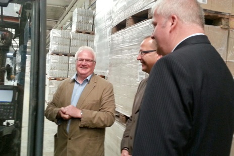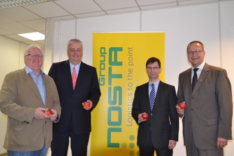 Die Stadthäger CDU-Politiker waren erfreut über den praktizierten Mix im Transportbereich. „Die tägliche Zulieferung in 10 bis 12 Eisenbahnwaggons aus der BERENTZEN-Produktion in Minden ersparen den Straßen und Menschen in der Region Tag für Tag rund 30 Lkw-Transporte. Das zeigt, dass Ökologie und Nachhaltigkeit für NOSTA keine Lippenbekenntnisse sondern gelebte Firmenphilosophie sind“, lobte Tadge. Vor Ort kümmert sich die NOSTA-Group unter anderem um die Einlagerung der Waren, die Auftragskommissionierung und die Versandvorbereitung. Hierzu stehen in Stadthagen nach Aussage des Niederlassungsleiter Ralf Hille 200.000 qm Grundfläche mit knapp 35.000 qm großräumiger Hallenfläche zur Verfügung. Die gesamte Lagerkapazität am Standort Stadthagen beträgt aktuell bis zu 35.000 Europaletten und der Warenumschlag umfasst bis zu 1.500 Paletten pro Tag. Frank Werner, Leiter Business Development aus der Osnabrücker Unternehmenszentrale, gab Balz und Tadge einen Gesamtüberblick: „Deutschlandweit unterhält das Unternehmen 40 Standorte an denen zur Zeit knapp 740 Mitarbeiter beschäftigt sind.“ Balz begrüßte die von Werner dargestellte beabsichtigte Ausweitung des Unternehmens auch in das benachbarte europäische Ausland: „Wenn NOSTA einem Auftraggeber nach Polen folgt, ist das gelebte europäische Wirklichkeit. Als erfolgreiches deutsches mittelständisches Unternehmen bestehen auch international gute Chancen, sich mit Qualität und Leistung durchzusetzen!“