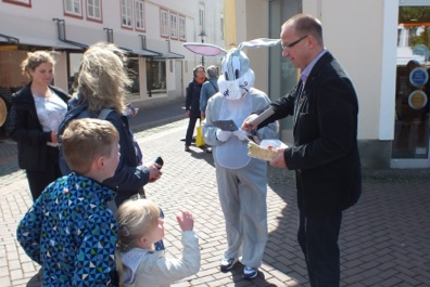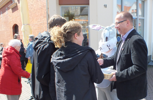 Da staunten die Passanten am Samstagmorgen auf dem Stadthäger Marktplatz nicht schlecht. Der Osterhase unterstützte CDU-Bürgermeisterkandidat Heiko Tadge aktiv bei der Verteilung von 600 Ostereiern an die Bürgerinnen und Bürger. Heiko Tadge verschenkte die Ostereier und wünschte allen ein frohes Osterfest. Auch die Ostergrußkarte mit einem von Tadge selbst ausprobierten Lammrezept kam hervorragend an. Kaum einer der Passanten lehnte ab. Im Gegenteil: Die Stimmung war gut und viele wünschten Tadge weiterhin viel Erfolg in seinem Wahlkampf. „Es hat richtig Spaß gemacht und der Osterhase war gerade für Kinder ein echter Hingucker und vielfaches Fotomodell“, freute sich Tadge über die gelungene Aktion in der Zeit von 9 bis 13 Uhr in der Innenstadt.